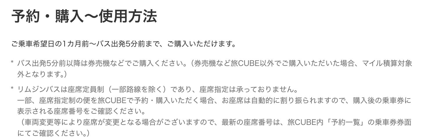 - 一部の「座席指定制の便」を旅CUBEで予約・購入する場合、座席は自動的に割り振られる(購入後の乗車券に表示される座席番号を確認)