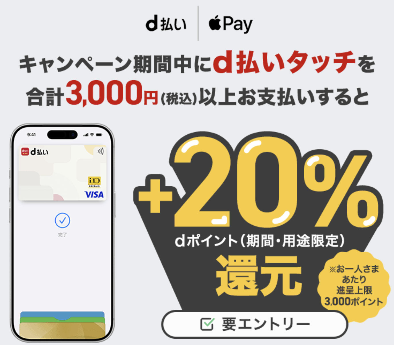 - d払いタッチ × Apple Pay:20%dポイント還元(上限3,000ポイント)