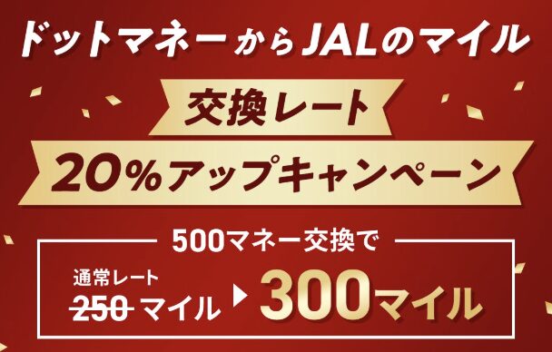 ドットマネーからJALマイルへの交換レートが期間限定で20%アップ。