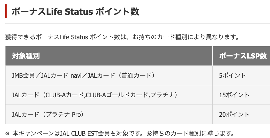 通常、JALカードは「2,000マイル(約20万円利用)=5 LSP」です。ここにボーナスで「+5 LSP」が付くため、合計10 LSP。つまり、レートが2倍になります。
