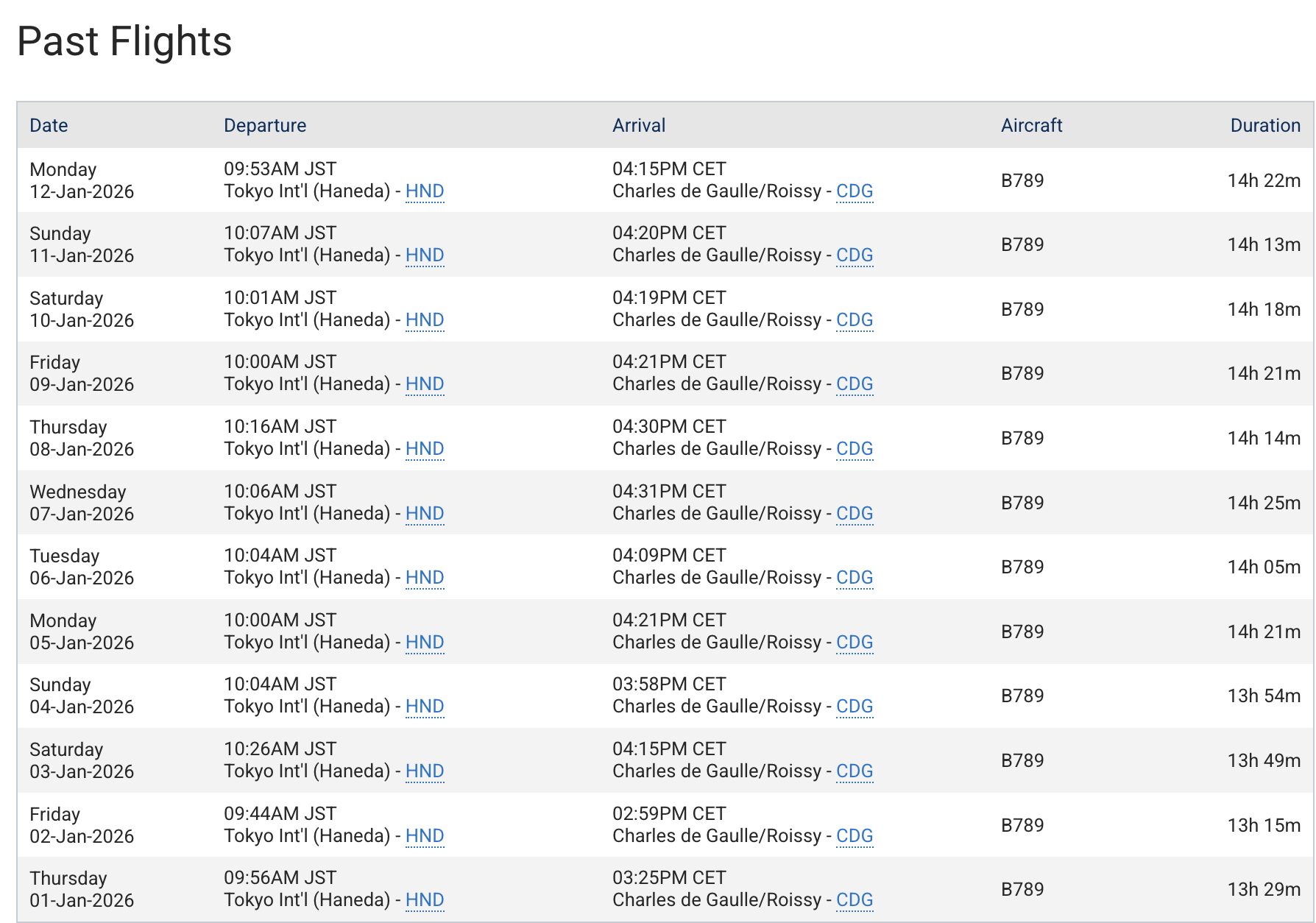 ここでのポイントは、「東京→パリ」みたいに路線で雑に見るんじゃなくて、便名(NH215)で見ること。
