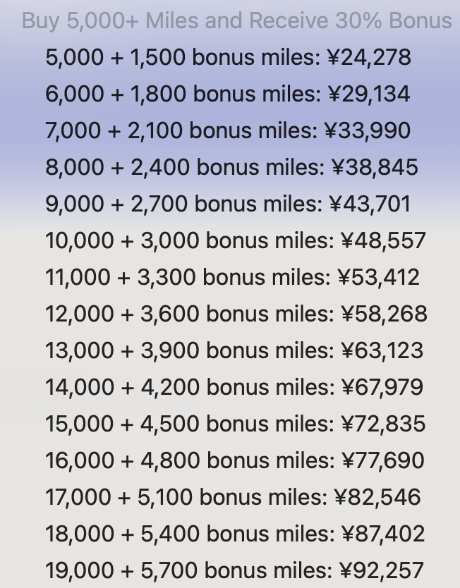 | 購入マイル数 | ボーナス | 合計マイル | 購入金額(円)目安 | 1マイルあたり単価(円) |