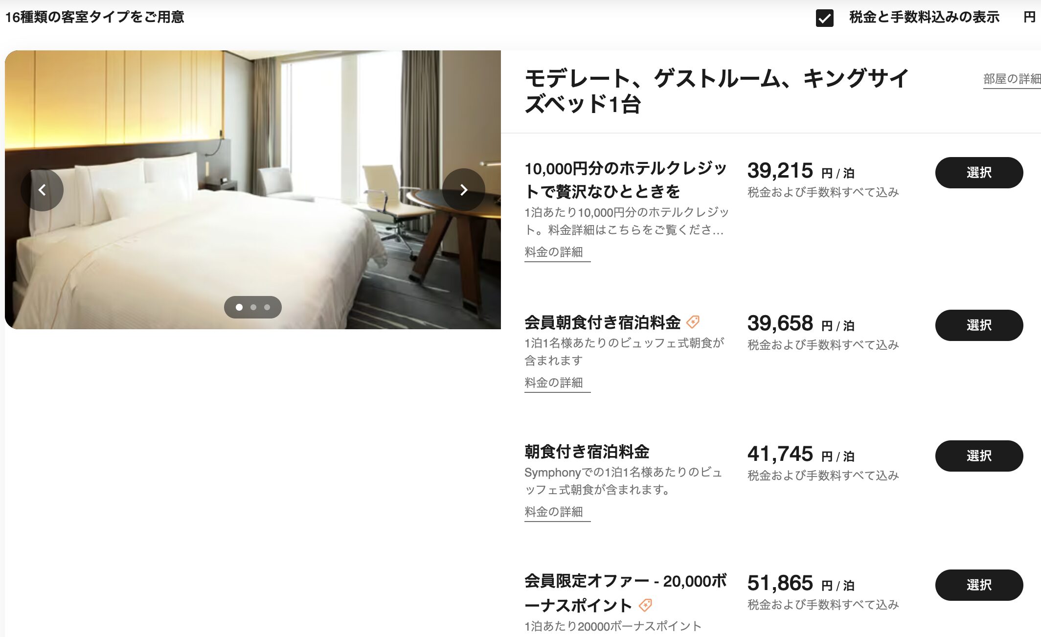 会員朝食付き | 39,685円 | 会員朝食ブッフェ(通常 ~4,427円×2名分) | 実質30,831円前後(朝食の価値を差し引き) |